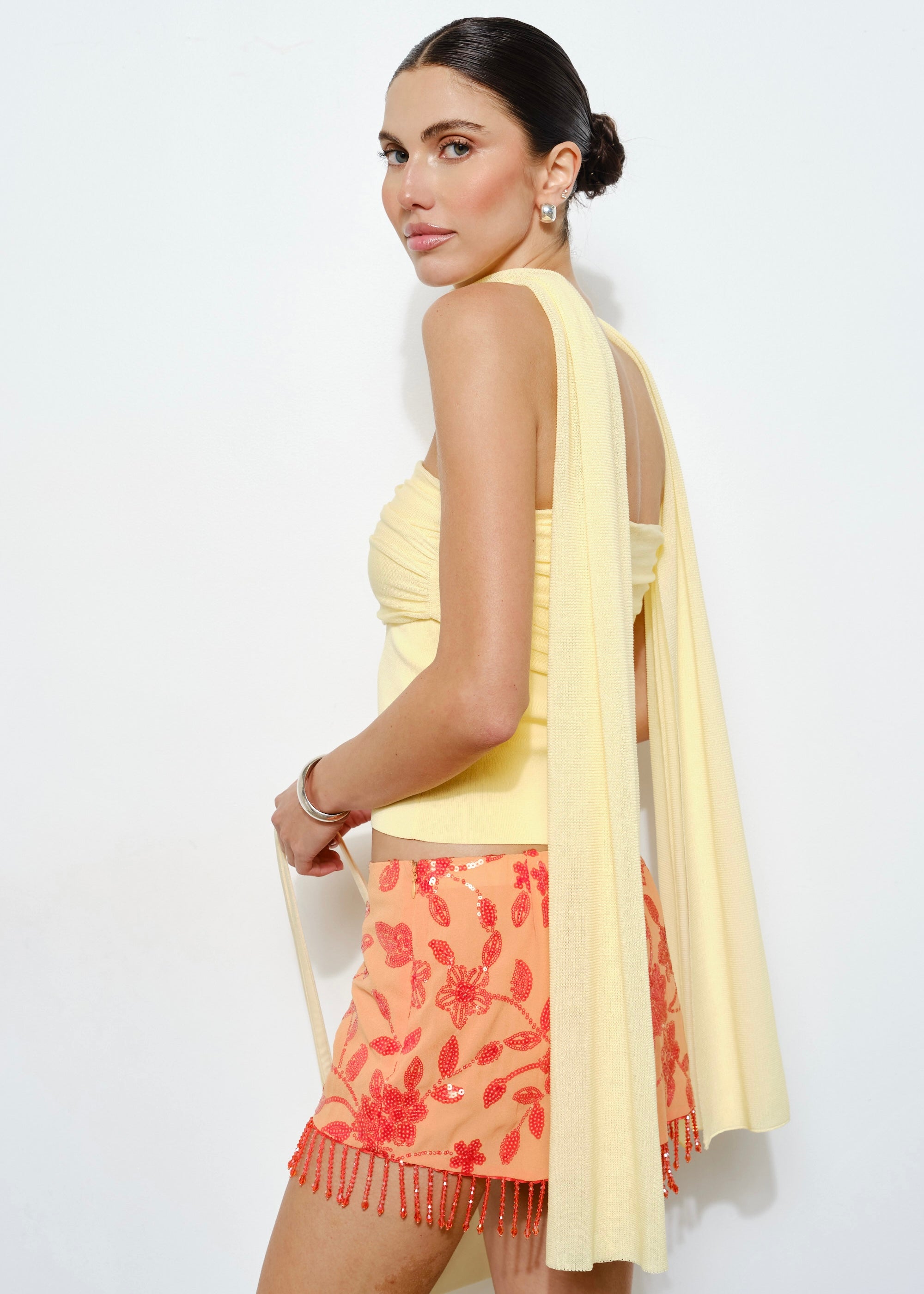 This dreamy buttery yellow strapless top is the perfect top! Designed with a soft, sculpted fit and paired with a matching adjustable scarf detail, she gives effortless glam from every angle. The scarf can be styled multiple ways.